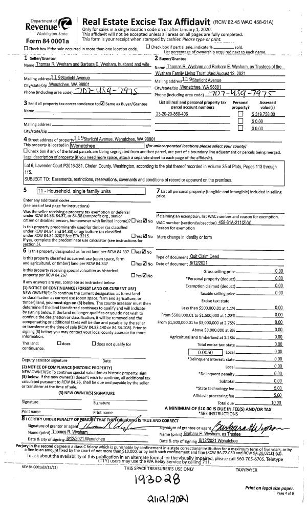 | 1 | 08/18/2021 | Q | Quit Claim Deed | WYSHAM THOMAS R & BARBARA E | WYSHAM FAMILY LIVING TRUST | | | $0.00 | 193028 | 2551002 |