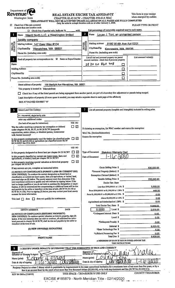 | 2 | 02/14/2020 | SWD | Statutory Warranty Deed | WAPITI NORTH LLC | TONI LOUAY J | | | $535,000.00 | 185879 | 2511104 |