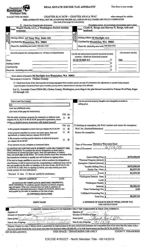 | 1 | 06/14/2019 | SWD | Statutory Warranty Deed | WAPITI NORTH LLC | BURGE HARVEY H & CANDI K | | | $470,900.00 | 183227 | 2497533 |