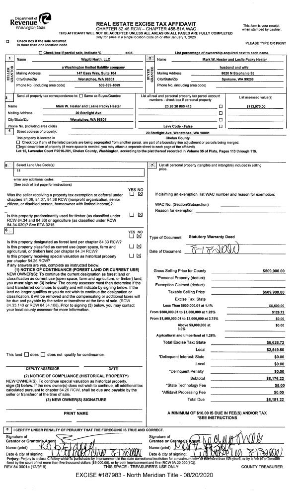 | 1 | 08/20/2020 | SWD | Statutory Warranty Deed | WAPITI NORTH LLC | HESTER MARK W & LESLIE P | | | $509,900.00 | 187983 | 2522697 |