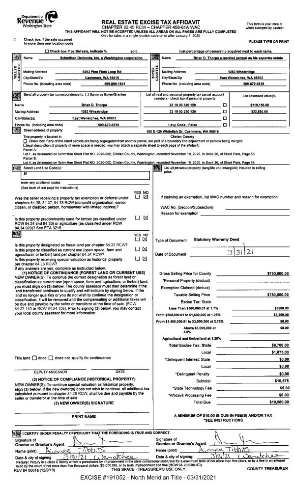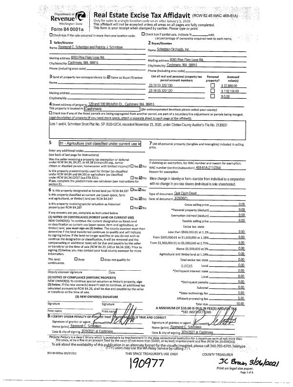 | 2 | 03/31/2021 | SWD | Statutory Warranty Deed | SCHMITTEN ORCHARDS INC | THORPE BRIAN D | | | $750,000.00 | 191052 | 2540463 |