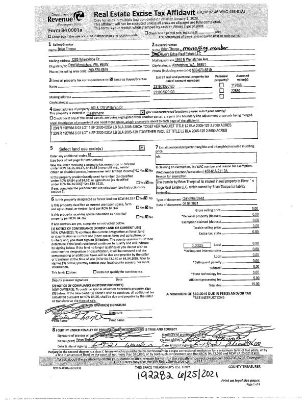 | 1 | 06/25/2021 | Q | Quit Claim Deed | THORPE BRIAN D | RIVER'S EDGE REAL ESTATE LLC | | | $0.00 | 192282 | 2547122 |