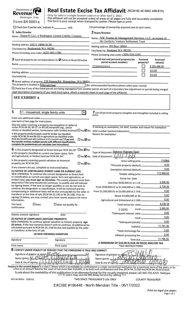 | 1 | 06/17/2022 | SWD | Statutory Warranty Deed | SIENNA 41 LLC | NW TRUSTEE & MANAGEMENT SERVICES LLC | | | $712,999.00 | 196448 | 2568993 |