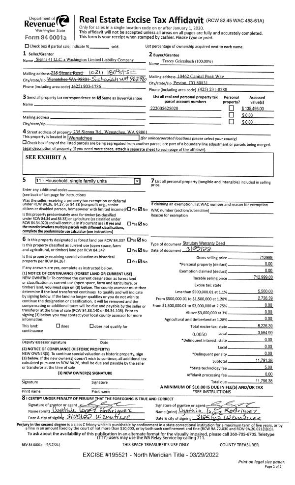 | 1 | 03/29/2022 | SWD | Statutory Warranty Deed | SIENNA 41 LLC | GEIERSBACH TRACEY | | | $712,999.00 | 195521 | 2564706 |