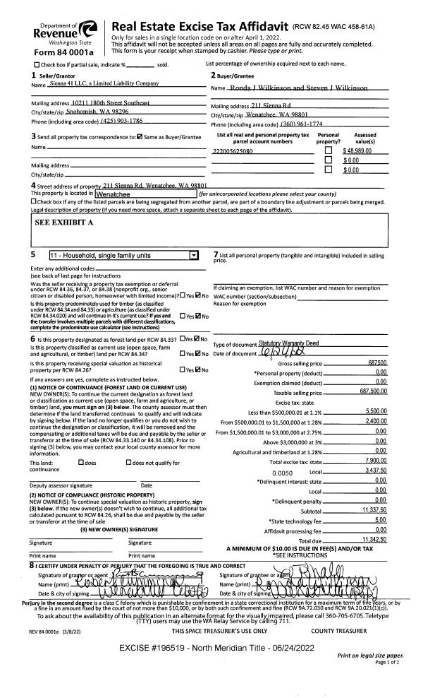 | 1 | 06/24/2022 | SWD | Statutory Warranty Deed | SIENNA 41 LLC | WILKINSON RONDA J & STEVEN J | | | $687,500.00 | 196519 | 2569282 |