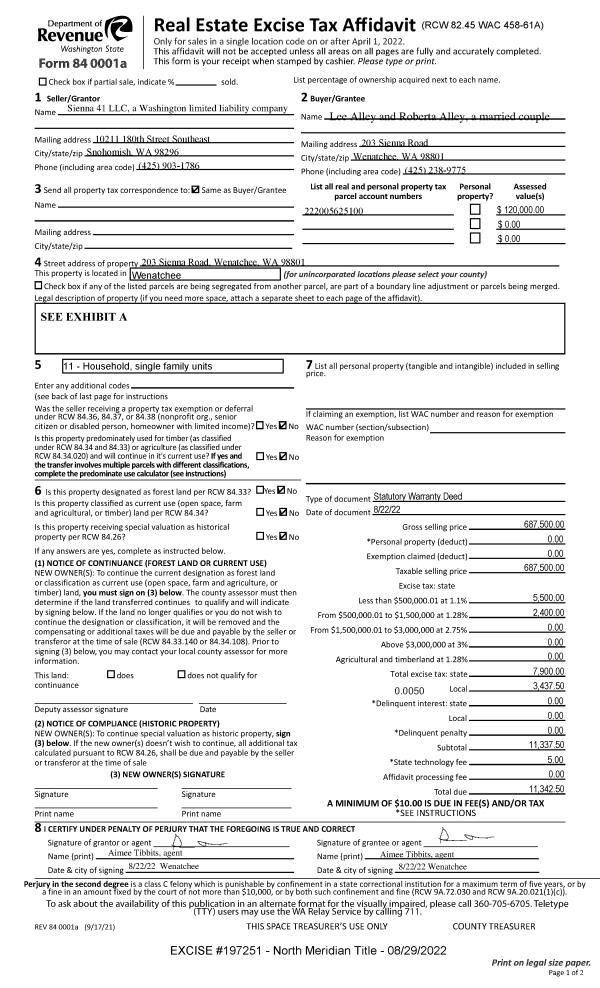 | 1 | 08/29/2022 | SWD | Statutory Warranty Deed | SIENNA 41 LLC | ALLEY LEE & ROBERTA | | | $687,500.00 | 197251 | 2572592 |