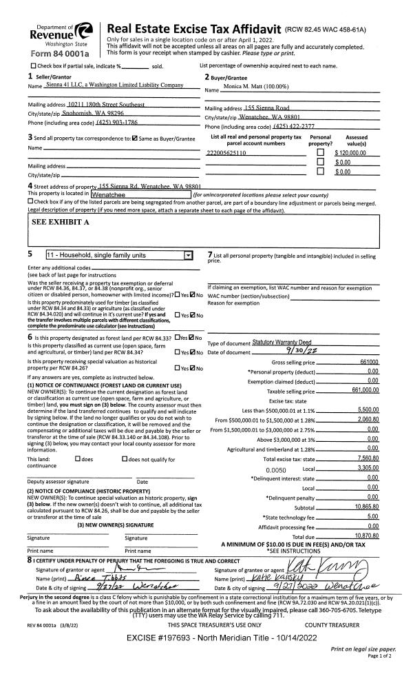 | 1 | 10/14/2022 | SWD | Statutory Warranty Deed | SIENNA 41 LLC | MATT MONICA M | | | $661,000.00 | 197693 | 2574669 |