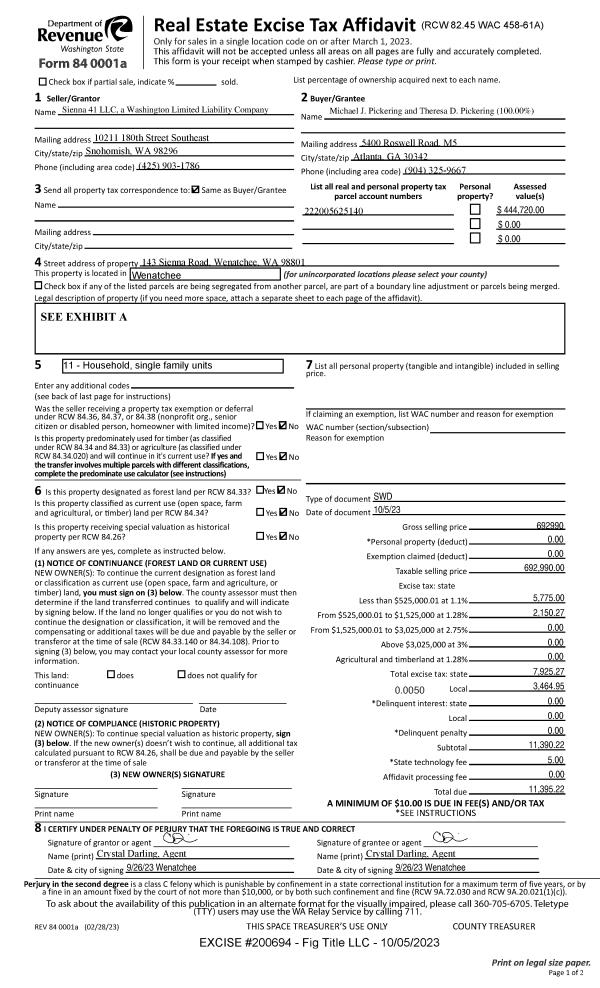 | 1 | 10/05/2023 | SWD | Statutory Warranty Deed | SIENNA 41 LLC | PICKERING MICHAEL J & THERESA D | | | $692,990.00 | 200694 | 2587077 |