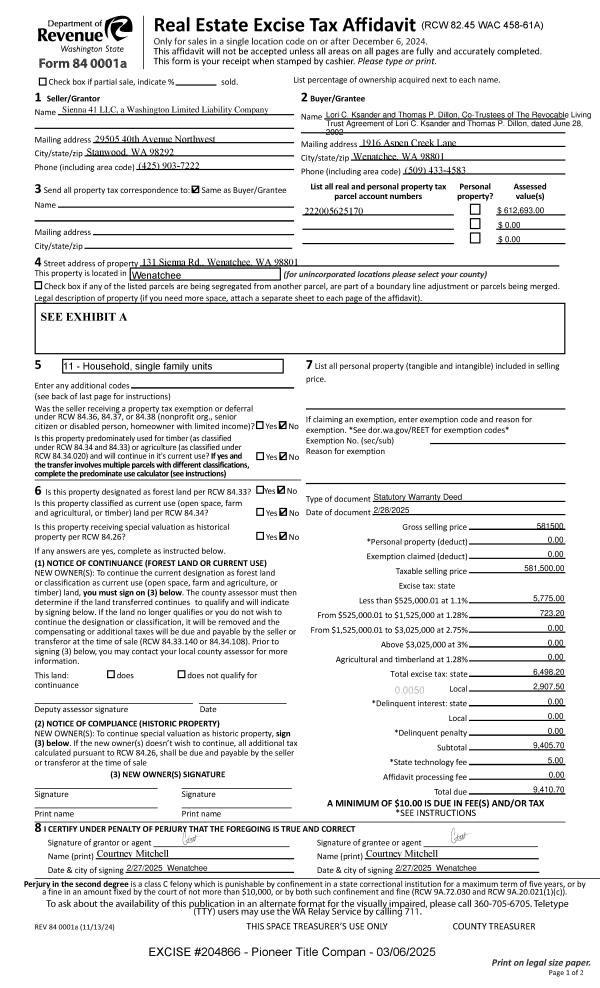 1 | 03/06/2025 | SWD | Statutory Warranty Deed | SIENNA 41 LLC | KSANDER LORI & DILLON THOMAS REVOCABLE LIVING TRUST | | | $581,500.00 | 204866 | 2605071 |