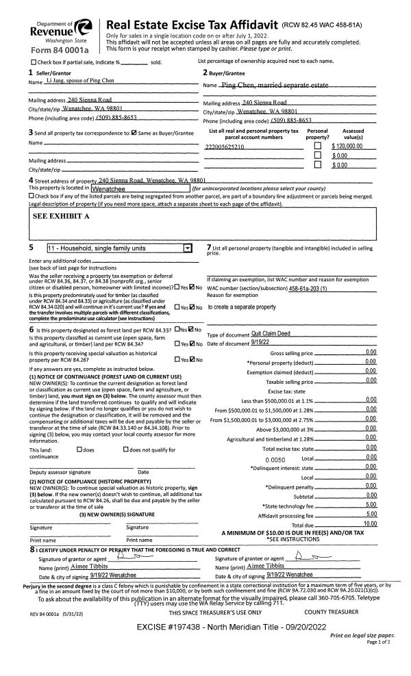1 | 09/19/2022 | Q | Quit Claim Deed | JANG LI | CHEN PING | | | $0.00 | 197438 | 2573508 |