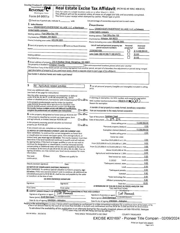 | 3 | 02/01/2021 | SWD | Statutory Warranty Deed | LINEAGE WA WENATCHEE RE LLC | RIVERFRONT VILLAGE PHASE 1 LLC | | | | 0 | 2535726 |