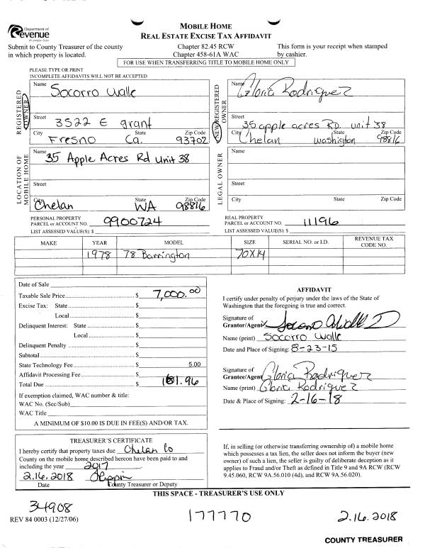 | 1 | 02/16/2018 | MH TITLE | Mobile Home Title | UVALLE SOCORRO | RODRIGUEZ GLORIA A | | | $7,000.00 | 177770 | |