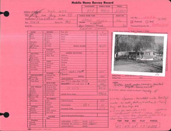 | Property ID: | 12246 | Abbreviated Legal Description: | APPLE ACRES MOBILE HOME PARK SPACE 52 75 MARLETTE 70X14 |