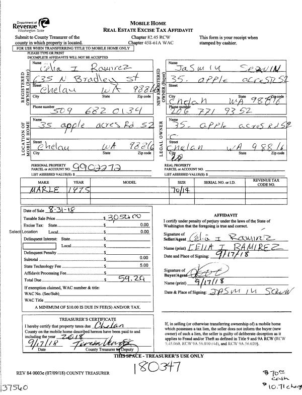 | 1 | 08/31/2018 | MH TITLE | Mobile Home Title | RAMIREZ CELIA I | SERVIN JASMIN | | | $3,050.00 | 180347 | |