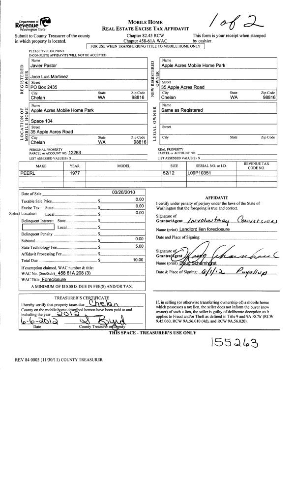 | 2 | 03/26/2010 | MH TITLE | Mobile Home Title | PASTOR JAVIER C | APPLE ACRES MOBILE HOME PARK | | | $0.00 | 155263 | |