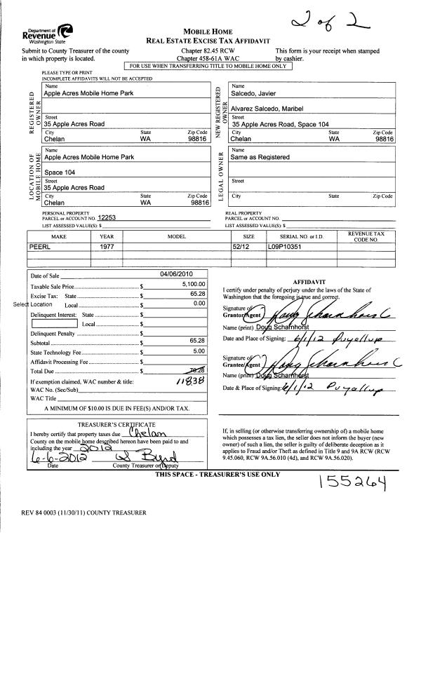 | 1 | 04/06/2010 | MH TITLE | Mobile Home Title | APPLE ACRES MOBILE HOME PARK | SALCEDO JAVIER & MARIBEL ALVAREZ | | | $5,100.00 | 155264 | |