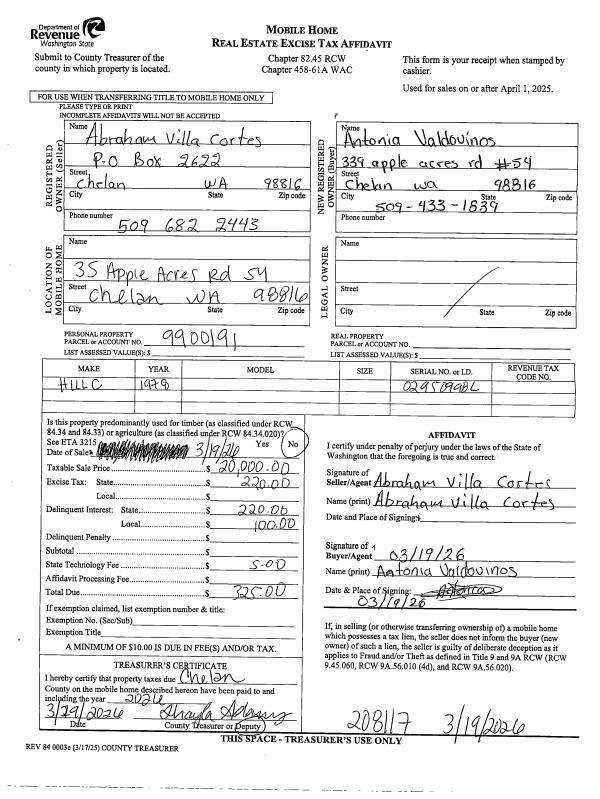 | 1 | 03/19/2026 | MH TITLE | Mobile Home Title | VILLA ABRAHAM CORTEZ | VALDOVINOS ANTONIA | | | $20,000.00 | 208117 | |