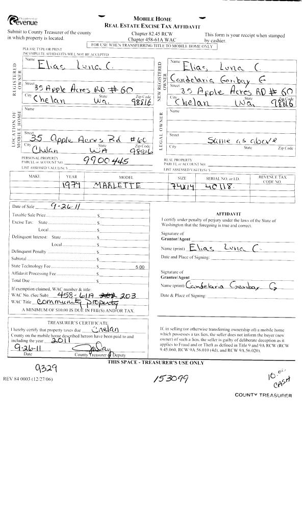 | 2 | 09/26/2011 | MH TITLE | Mobile Home Title | LUNA ELIAS C | LUNA ELIAS C & CANDELARIA GARIBAY | | | $0.00 | 153099 | |