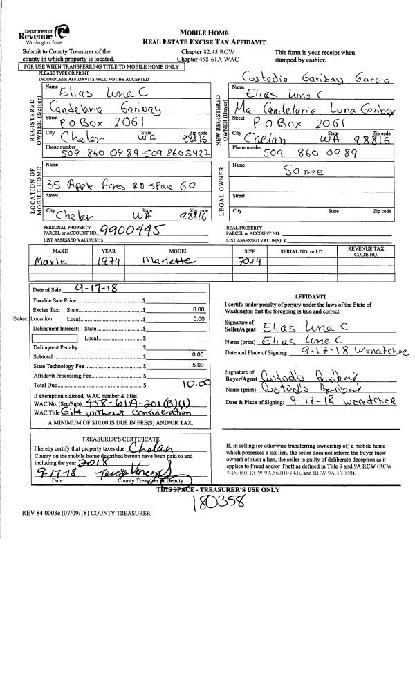 | 1 | 09/17/2018 | MH TITLE | Mobile Home Title | LUNA ELIAS C & CANDELARIA GARIBAY | GARIBAY CUSTODIO GARCIA ETAL | | | $0.00 | 180358 | |