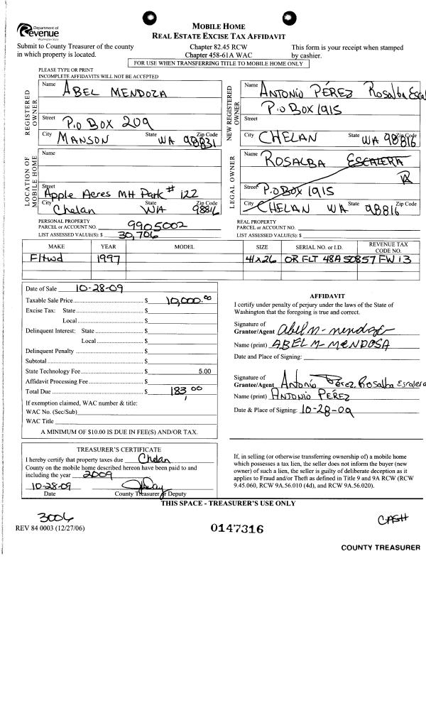 | 1 | 10/28/2009 | AFF | Affidavit | MENDOZA ABEL M | PEREZ ANTONIO & ROSALBA | | | $10,000.00 | 147316 | |