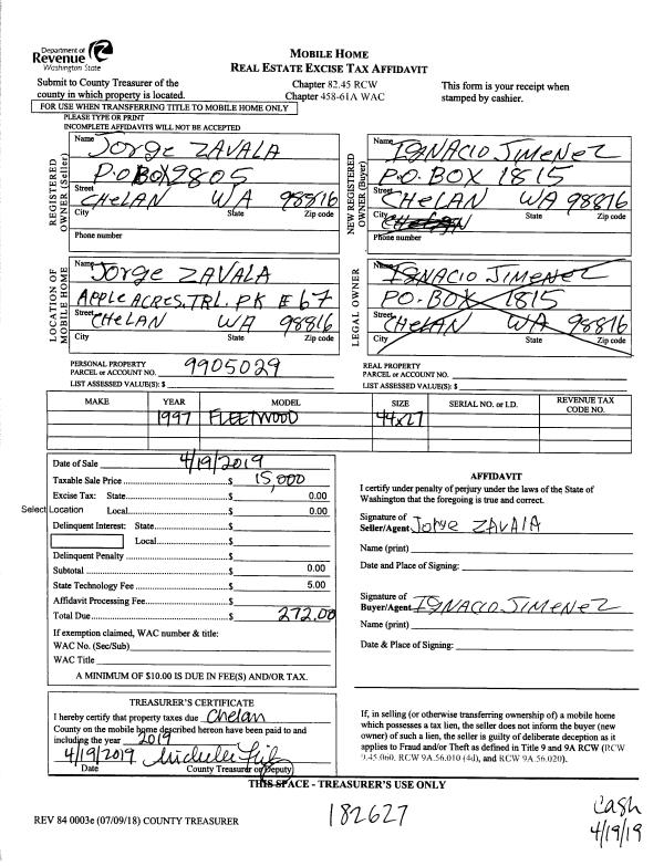 | 1 | 04/19/2019 | MH TITLE | Mobile Home Title | ZAVALA JORGE | JIMENEZ IGNACIO | | | $15,000.00 | 182627 | |