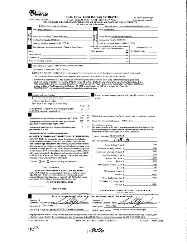 | 2 | 01/08/2007 | Q | Quit Claim Deed | | PISCO CHELAN LLC | | | | 0 | 2246238 |