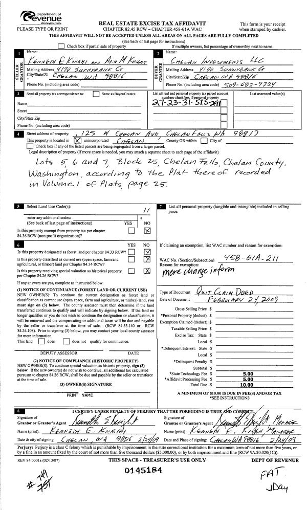 | 3 | 03/02/2009 | Q | Quit Claim Deed | KNIGHT KENNETH E & ANN M | CHELAN INVESTMENTS LLC | | | $0.00 | 145184 | 2298269 |