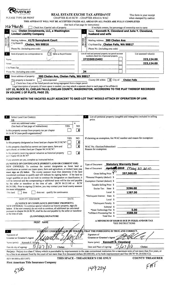 | 2 | 05/27/2010 | SWD | Statutory Warranty Deed | CHELAN INVESTMENTS LLC | CLEVELAND KENNETH R & JULIE Y | | | $257,500.00 | 149224 | 2324864 |