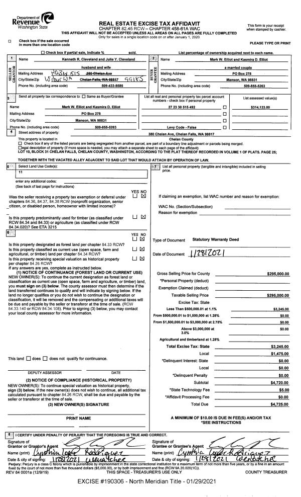 | 1 | 01/29/2021 | SWD | Statutory Warranty Deed | CLEVELAND KENNETH R & JULIE Y | ELLIOT MARK W & KASMIRA D | | | $295,000.00 | 190306 | 2535505 |